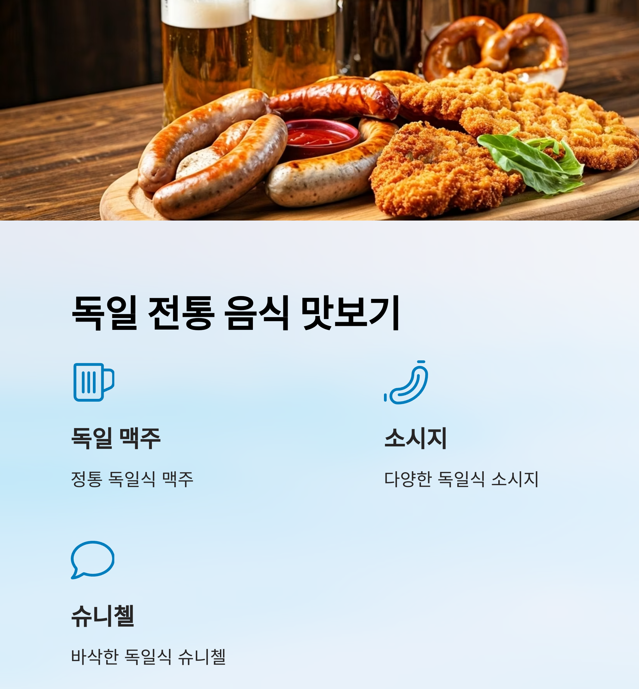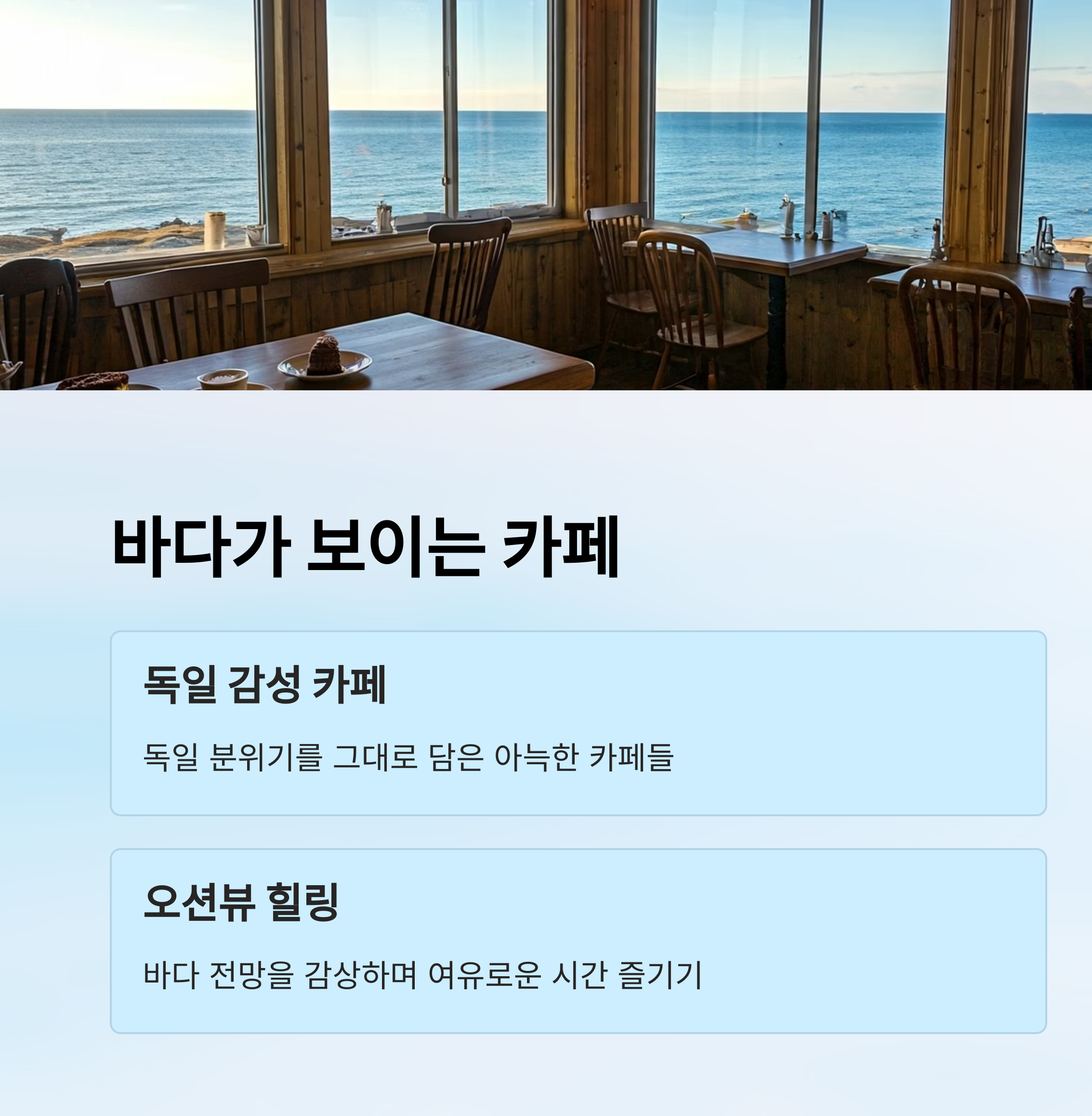 | 카이막, 슈니첼 등 독일 현지 느낌의 맛 | 바다와 어우러진 힐링 감성 뷰 제공 | 야외 좌석과 전용 공간을 제공하는 카페 |