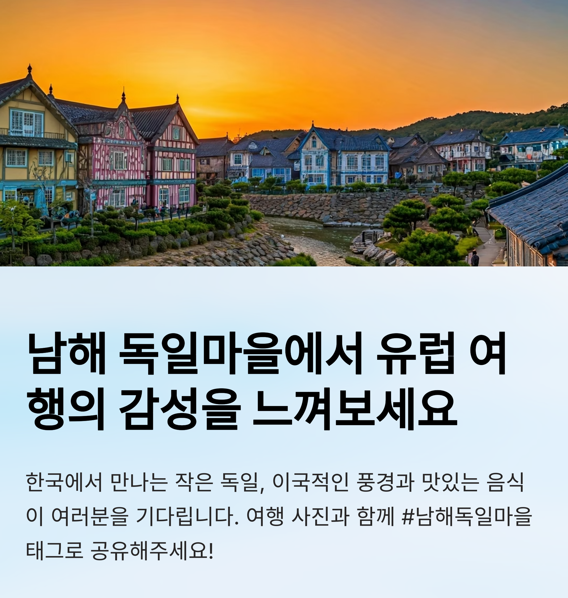 1960년대 파독 광부와 간호사들이 돌아와 정착하며 만든 이곳은 독일 전통 건축물과 문화가 어우러져 이국적인 분위기를 자아냅니다. 길을 따라 늘어선 붉은 지붕 주택들과 나무 창틀, 그리고 조용한 바닷바람이 어우러져 일상의 스트레스를 내려놓고 자연과 역사에 몰입할 수 있는 감성적인 공간으로 사랑받고 있습니다.