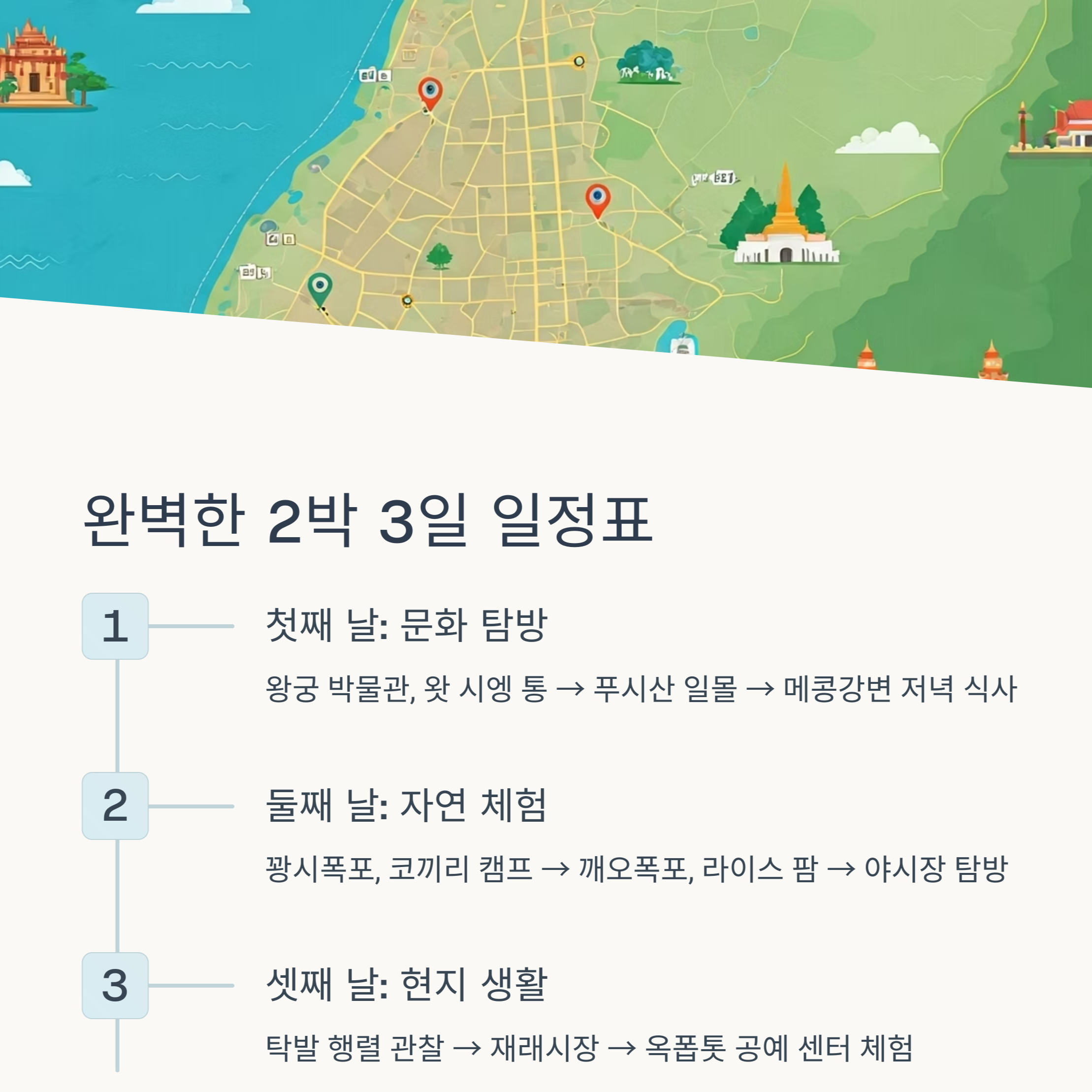 루앙프라방 자유여행은 자연, 문화, 음식까지 세 가지 매력을 모두 갖춘 특별한 경험을 선사합니다. 특히 꽝시폭포의 시원한 자연과 푸시산 전망대에서의 고요한 일몰, 야시장의 활기찬 분위기는 여행의 흐름에 완벽한 조화를 더합니다. 일정만 잘 계획하면 2박 3일 안에 주요 스폿을 효율적으로 즐길 수 있으며, 현지 물가도 비교적 저렴해 예산 부담도 적은 편입니다. 라오스의 전통과 현대가 공존하는 루앙프라방에서 잊지 못할 추억을 만들어보세요.