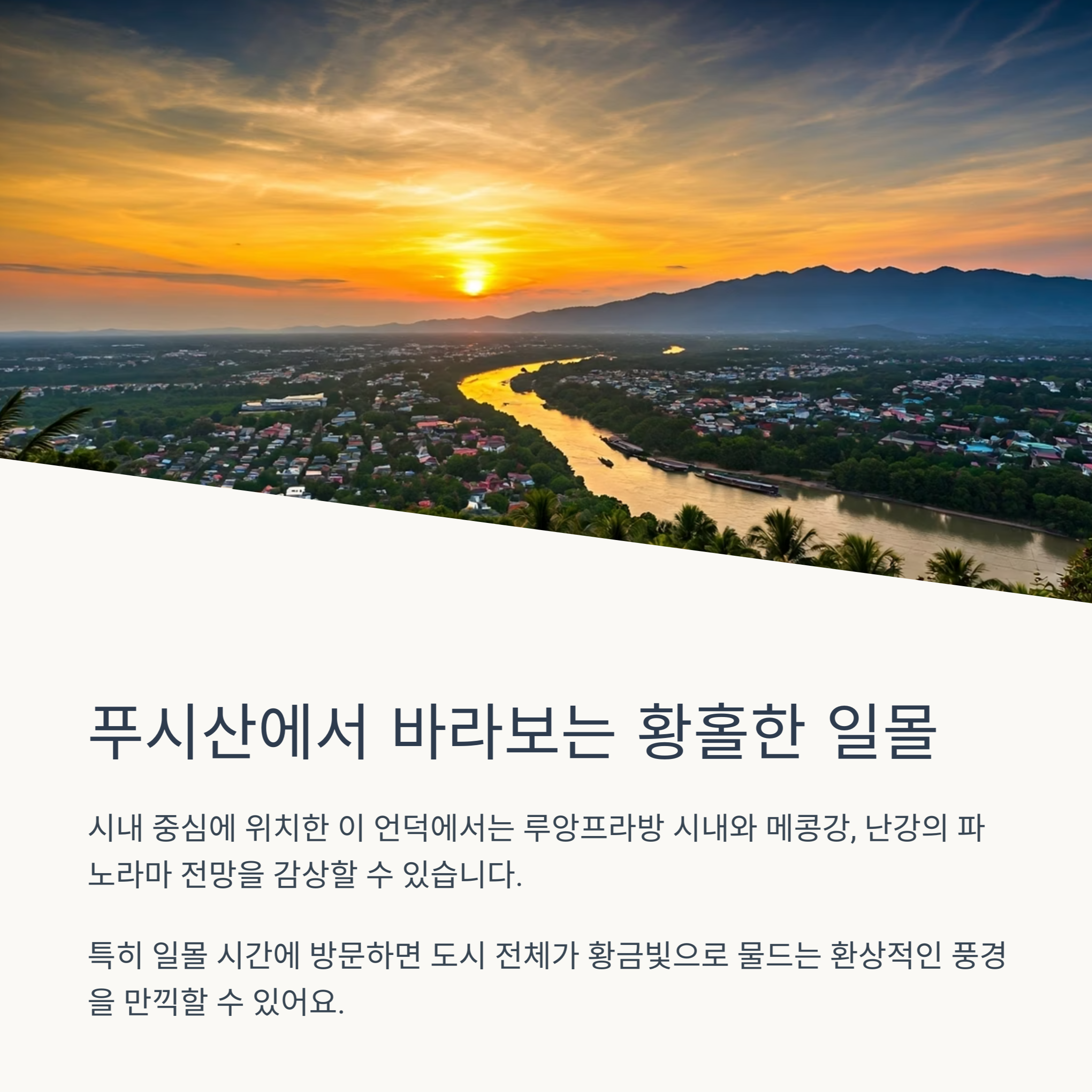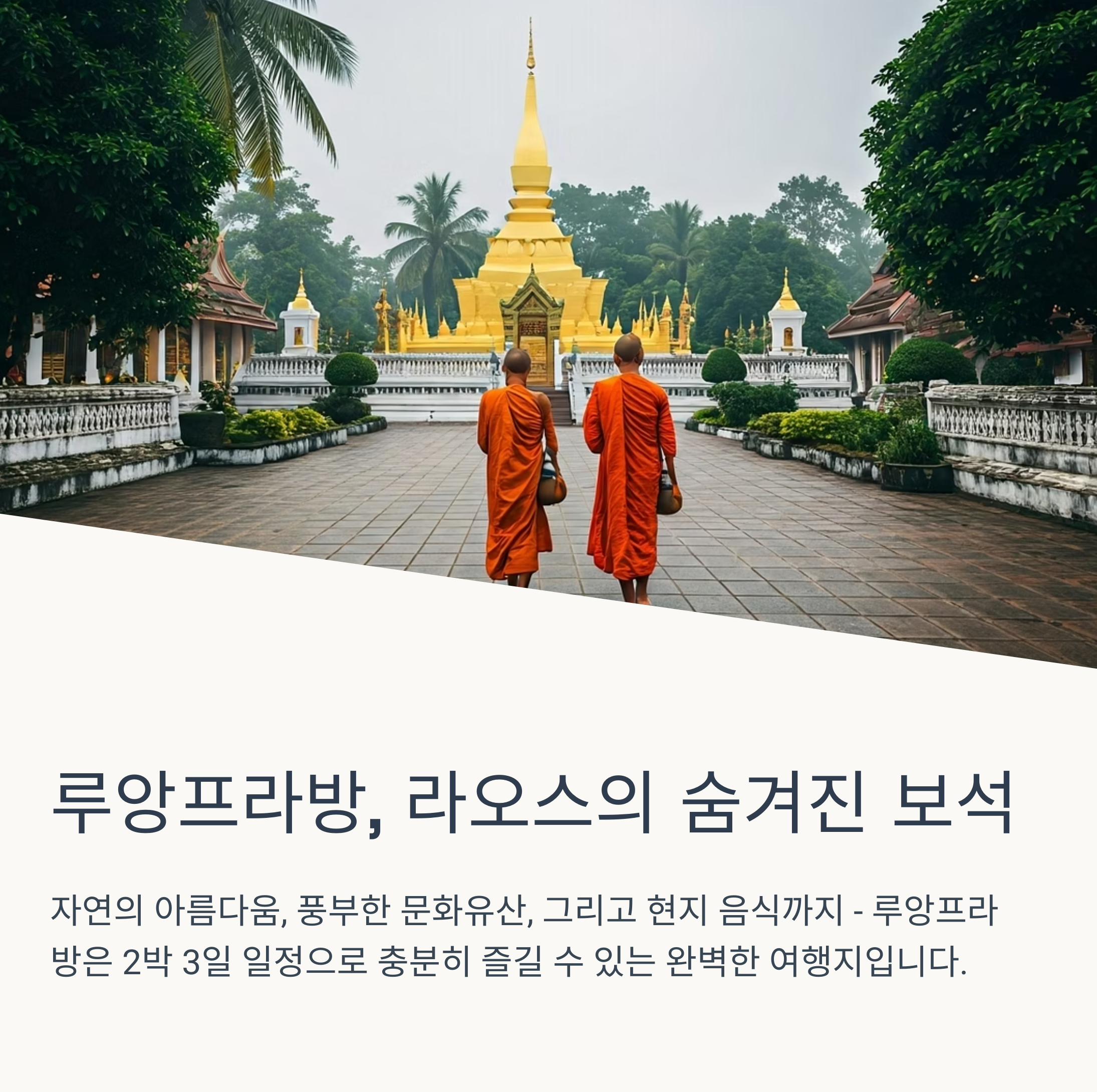 루앙프라방은 라오스 북부에 위치한 고즈넉한 도시로, 자연과 전통 문화가 조화를 이루는 여행지입니다. 특히 꽝시폭포의 에메랄드빛 수영장, 야시장의 활기찬 분위기, 그리고 푸시산에서의 석양까지, 감성적인 여행을 원하는 이들에게 최적의 장소로 손꼽히고 있습니다. 본 포스팅에서는 루앙프라방의 대표 명소들을 중심으로 자유여행 코스를 정리하여 안내드립니다. 실용적인 이동 팁부터, 식사와 기념품 구매 장소, 현지 문화를 체험할 수 있는 스팟까지 상세히 다뤄드릴 예정이니 끝까지 집중해 주세요. 라오스 여행을 계획 중이시라면 오늘의 포스팅을 통해 알차고 후회 없는 일정을 구성하실 수 있을 것입니다.