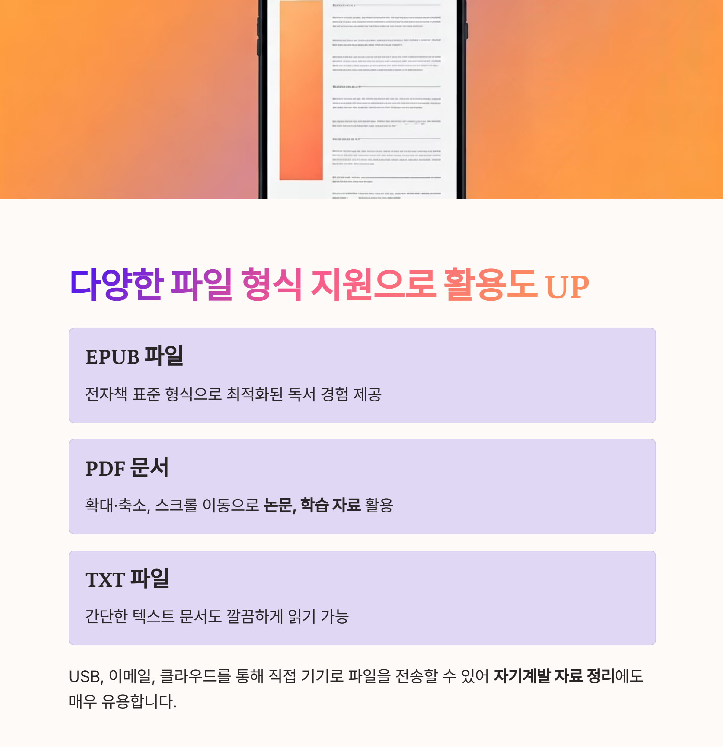 리디북스에서 구매한 책뿐 아니라 EPUB, PDF, TXT 파일도 USB, 이메일, 클라우드로 넣어 사용할 수 있습니다.