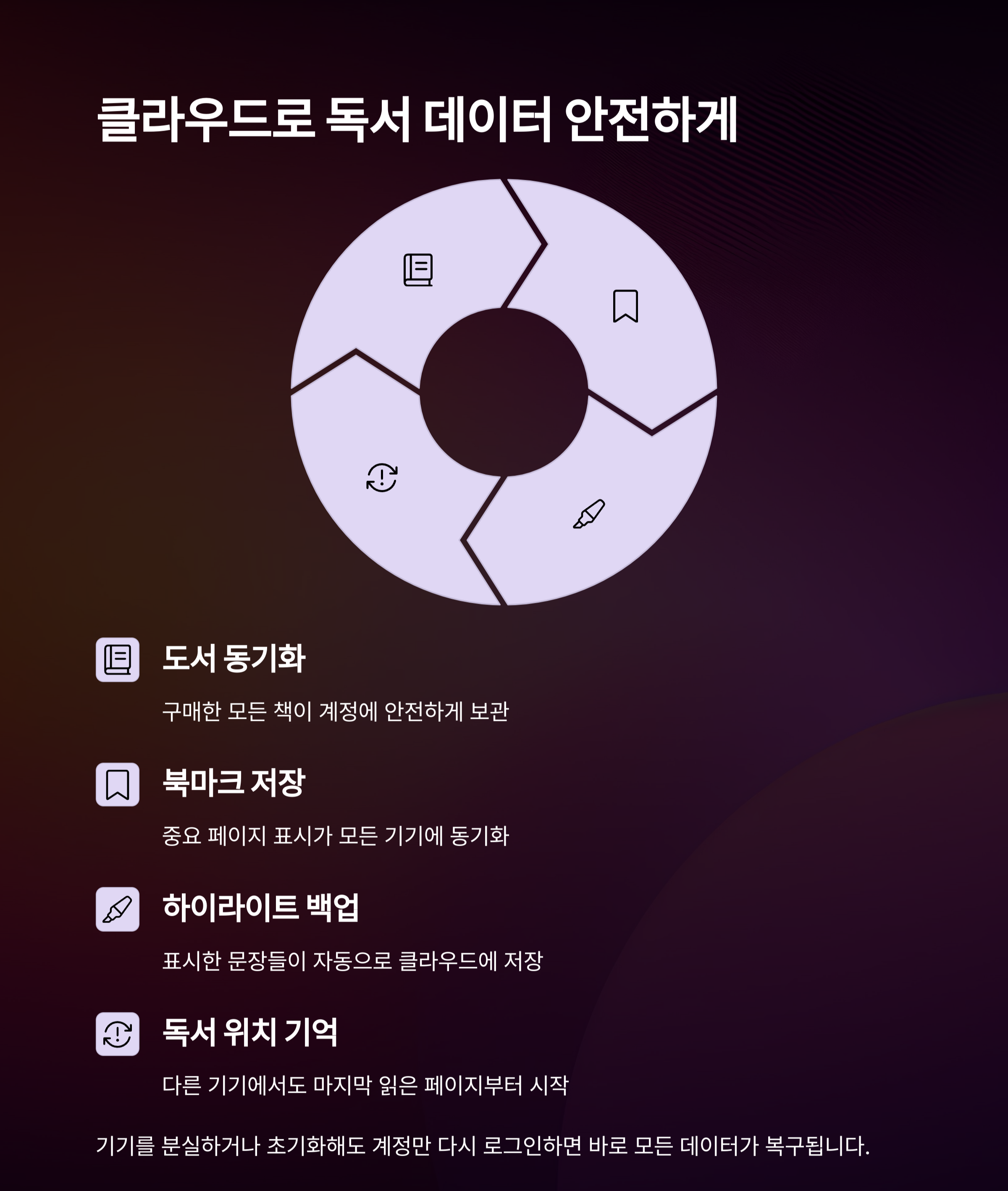 기기를 분실하거나 초기화하더라도 계정 로그인만으로 모든 데이터를 복구할 수 있고, 읽던 위치까지 동기화되어 다른 기기에서도 이어서 읽을 수 있습니다.