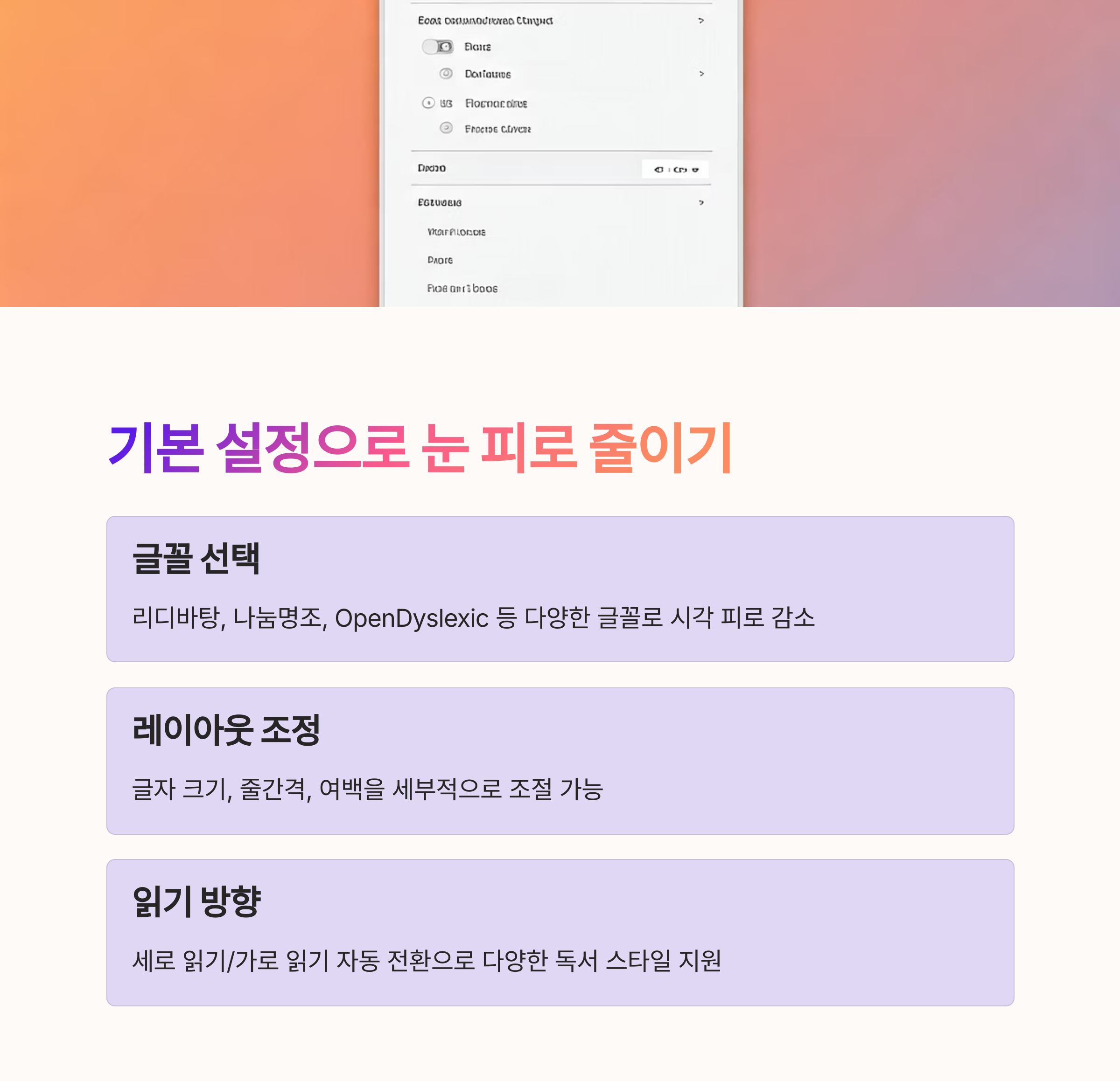 ‘리디바탕’, ‘나눔명조’, ‘OpenDyslexic’ 등 다양한 폰트를 제공하며, 세로 읽기/가로 읽기 자동 전환 기능으로 다양한 독서 방식에 유연하게 대응합니다.
