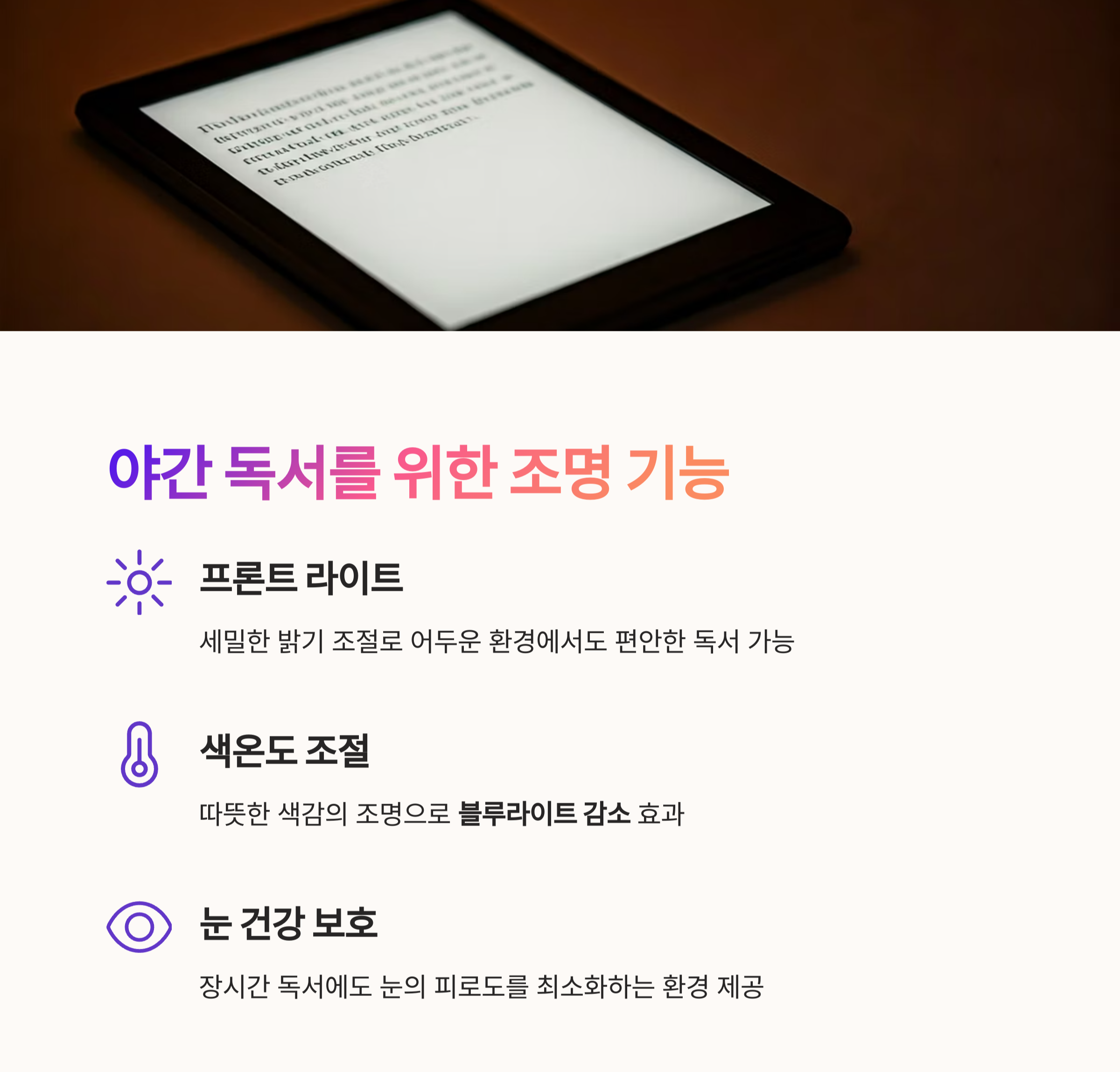 조명 밝기뿐 아니라 따뜻한 색감으로 블루라이트를 줄여주는 색온도 조절도 가능해, 밤에도 눈이 편안한 독서 환경을 유지할 수 있습니다.