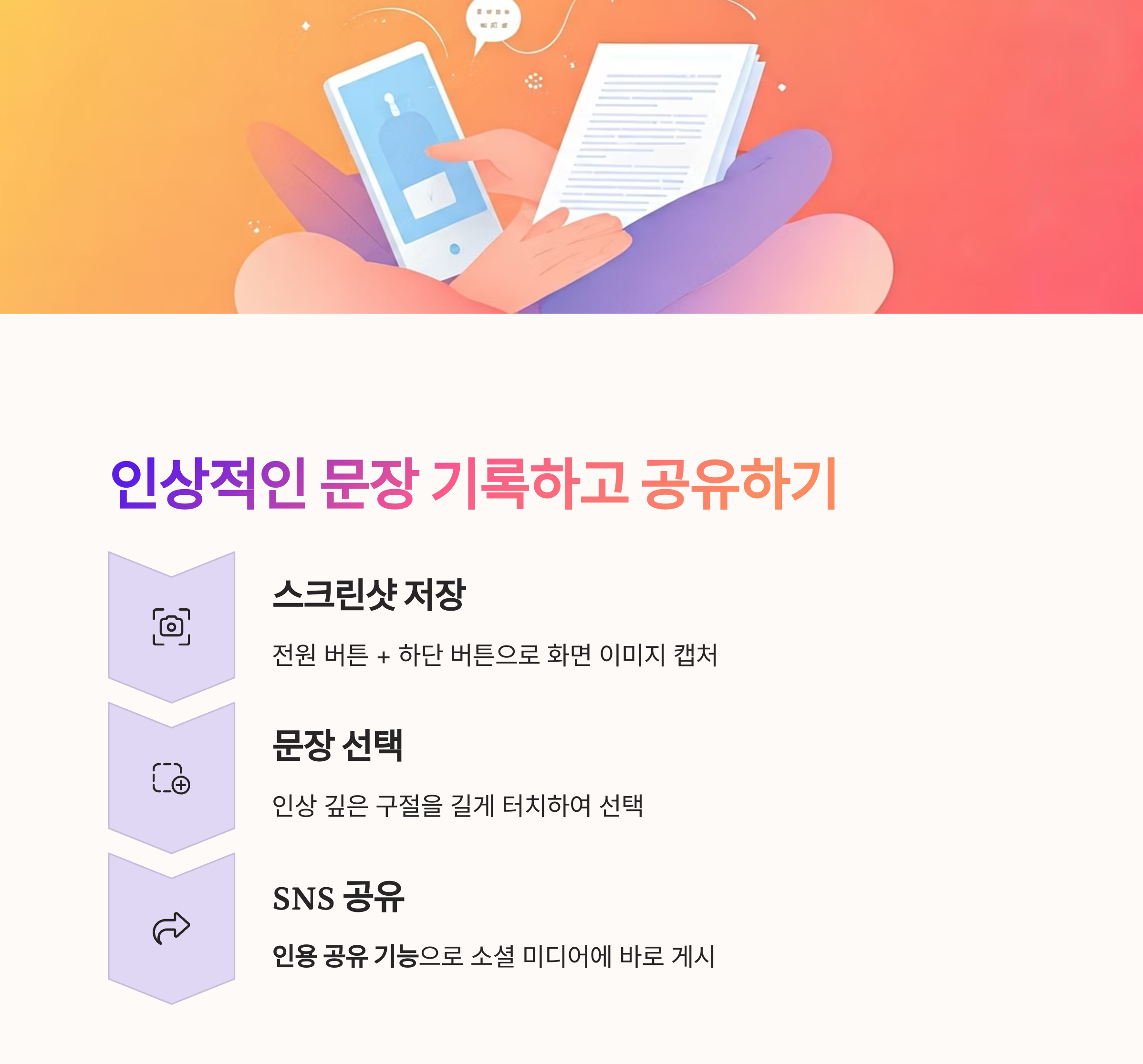 중요한 문장은 스크린샷 기능으로 저장하거나, 문장을 선택 후 ‘인용 공유’로 SNS에 바로 업로드할 수 있습니다.