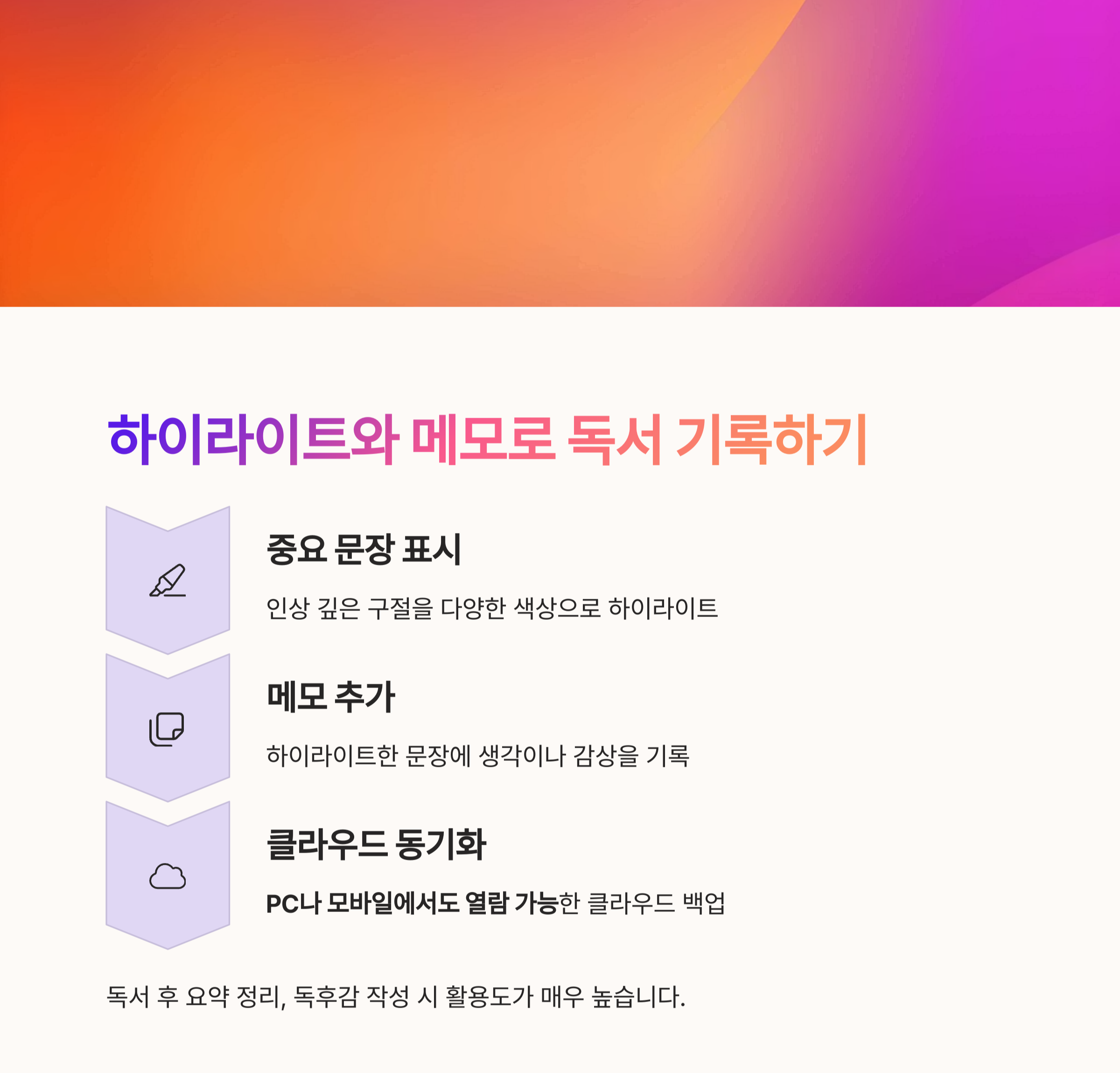 하이라이트한 문장에 메모도 남길 수 있고, 이 모든 정보는 클라우드와 동기화되어 PC나 모바일에서도 확인할 수 있습니다.